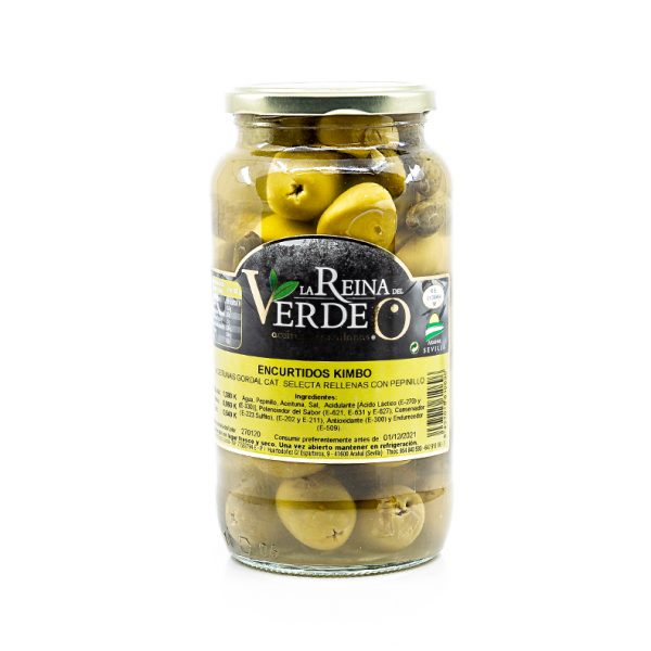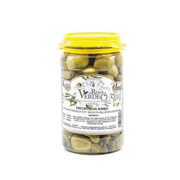 Aceitunas Gordales Sevillanas Natural Sin Hueso. Aceitunas Selectas rellena a mano de pepinillos, aderezadas con sabor a anchoas. Recolectada de forma artesanal mediante el método del ordeño a macaco. Proceso de curación cocidas en sosa cáustica. Categoría Selecta.